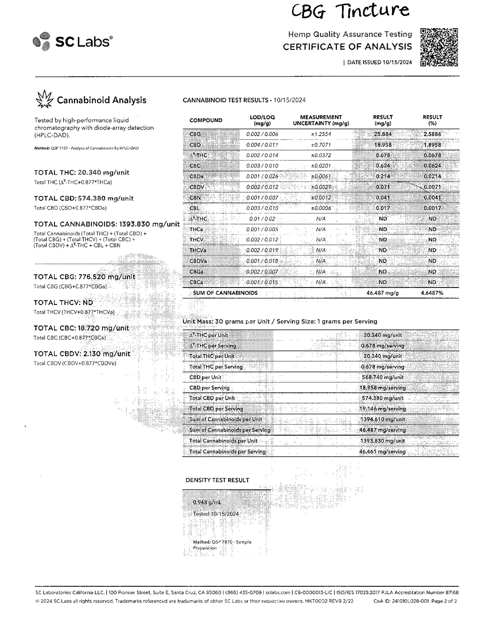 Cannabinoids per serving: 26mg CBG, 19mg CBD, .7mg THC. Total cannabinoids per tincture: 1370mg. Solventless Extraction of nano-sized particles for excellent absorption.