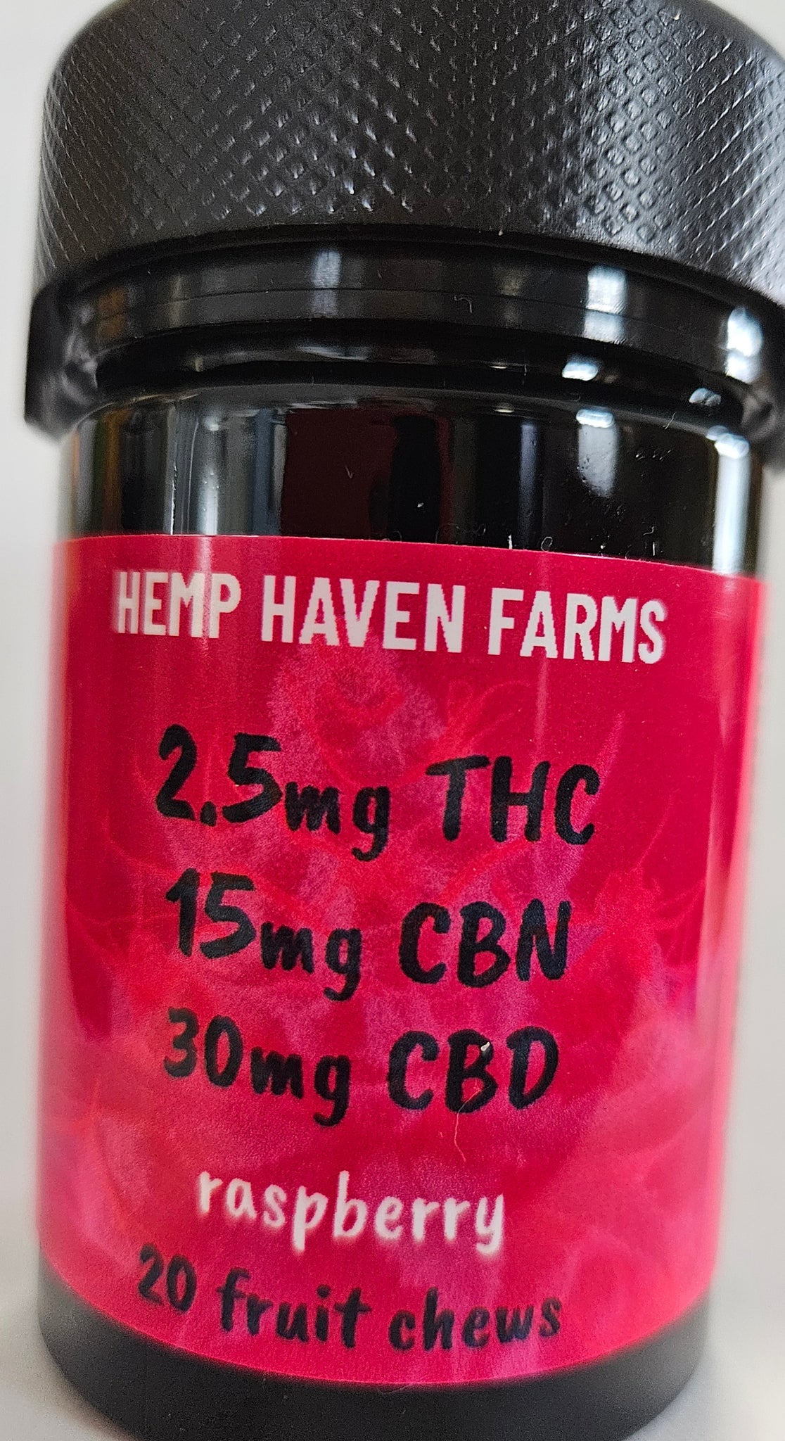 Do you have difficulties falling asleep? Perhaps we have an antidote for you: Delicious, natural, organic, vegan raspberry fruit chews made with real fruit! Enjoy 2.5mg of Hemp Derived Delta-9 THC along with 15mg CBN and 30mg CBD for relaxation, anxiety relief and sleep. These fruit chews are packed with powerful cannabinoids to aid in sleep.