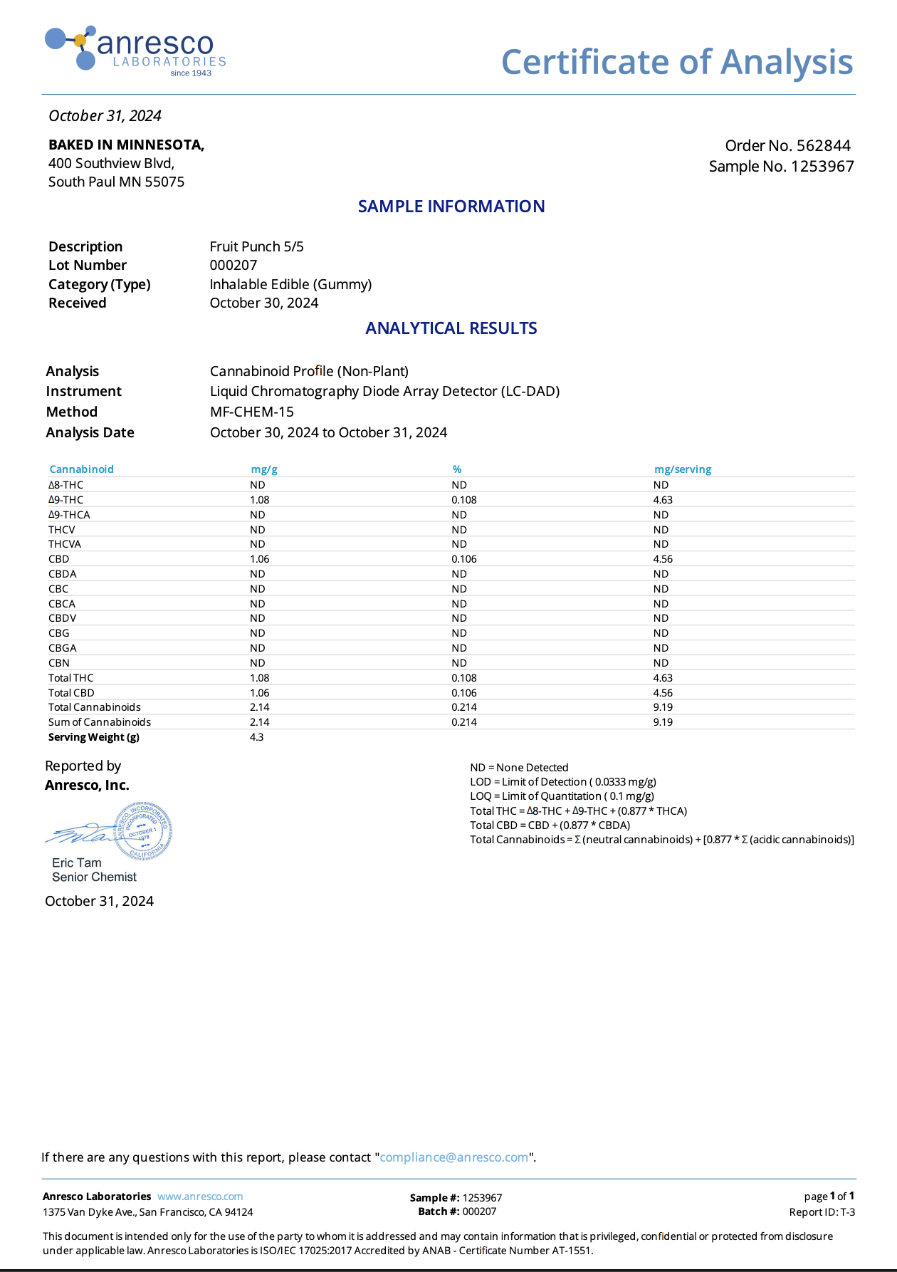 • Cannabinoid Ratio: 5mg THC, 5mg CBD per chew.